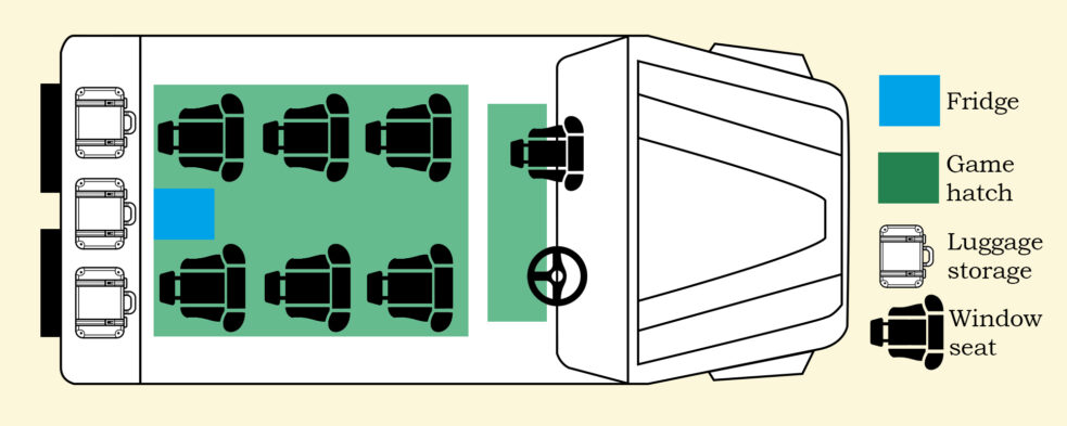 The passenger compartment is equipped with six individual and comfortable seats guaranteeing a window seat for each guest. In addition, a seventh seat is available next to the guide. All our vehicles are fitted with a safari fridge, powered by the car battery, for keeping your drinks cold and refreshing.